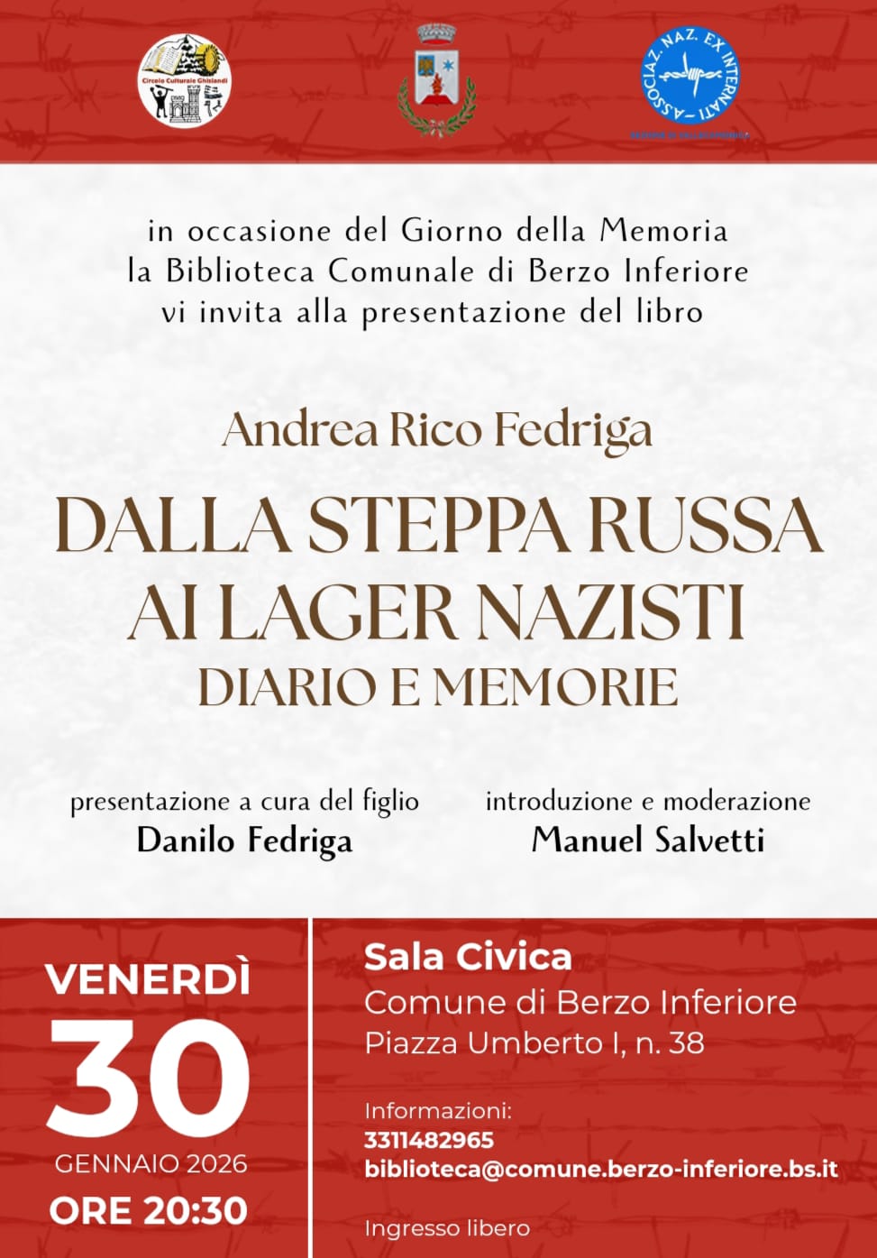 In occasione del Giorno della Memoria, la Biblioteca di Berzo Inferiore vi invita alla presentazione del libro "Dalla steppa russa ai lager nazisti", che si terrà venerdì 30 gennaio alle ore 20.30 presso la Sala Civica Comunale. Vedi allegato