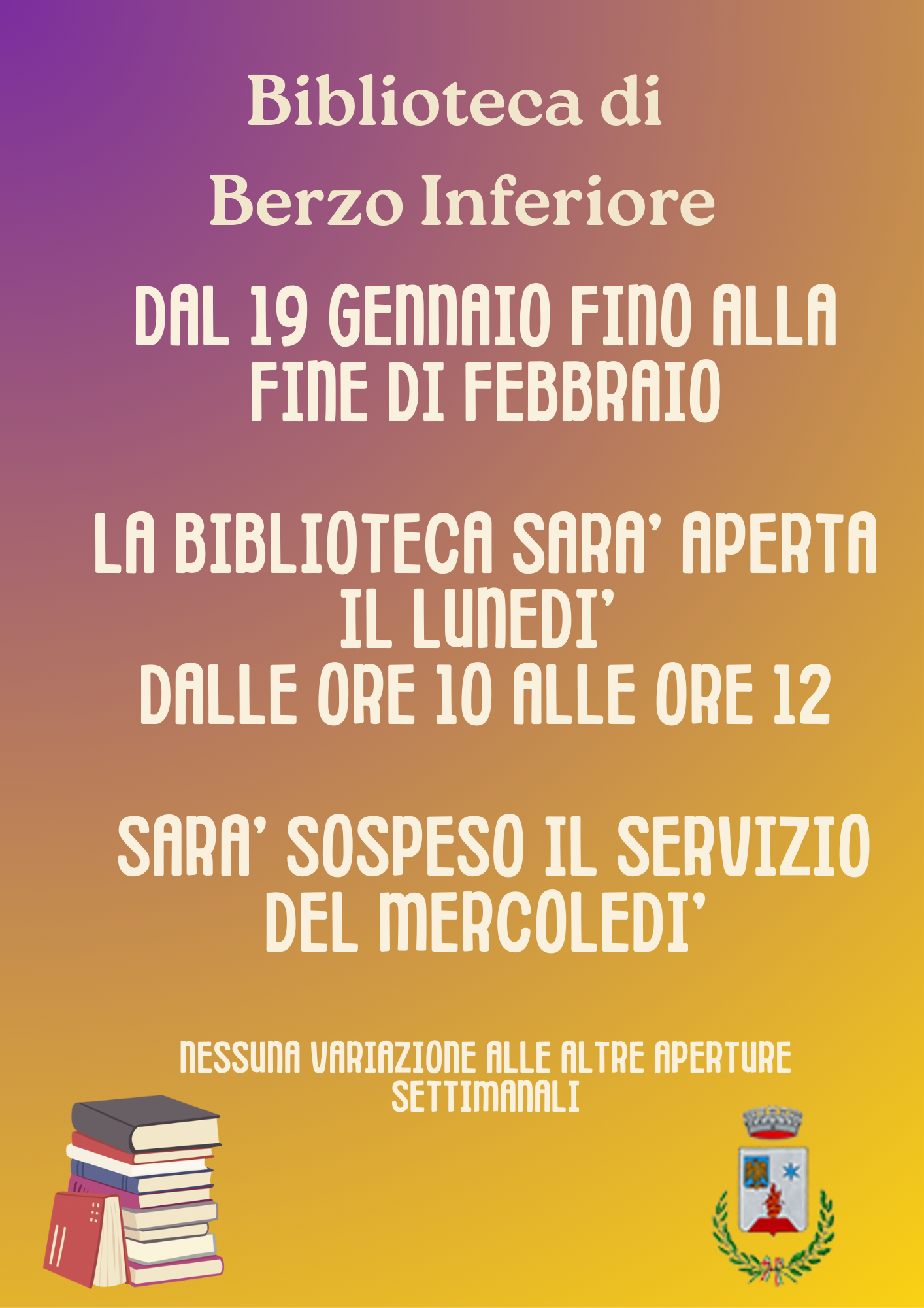 Descrizione La biblioteca di Berzo Inferiore sospenderà il servizio del mercoledì a partire dal 19 febbraio 2026 fino a fine febbraio 2026.Nessuna variazione alle altre aperture settimanali.